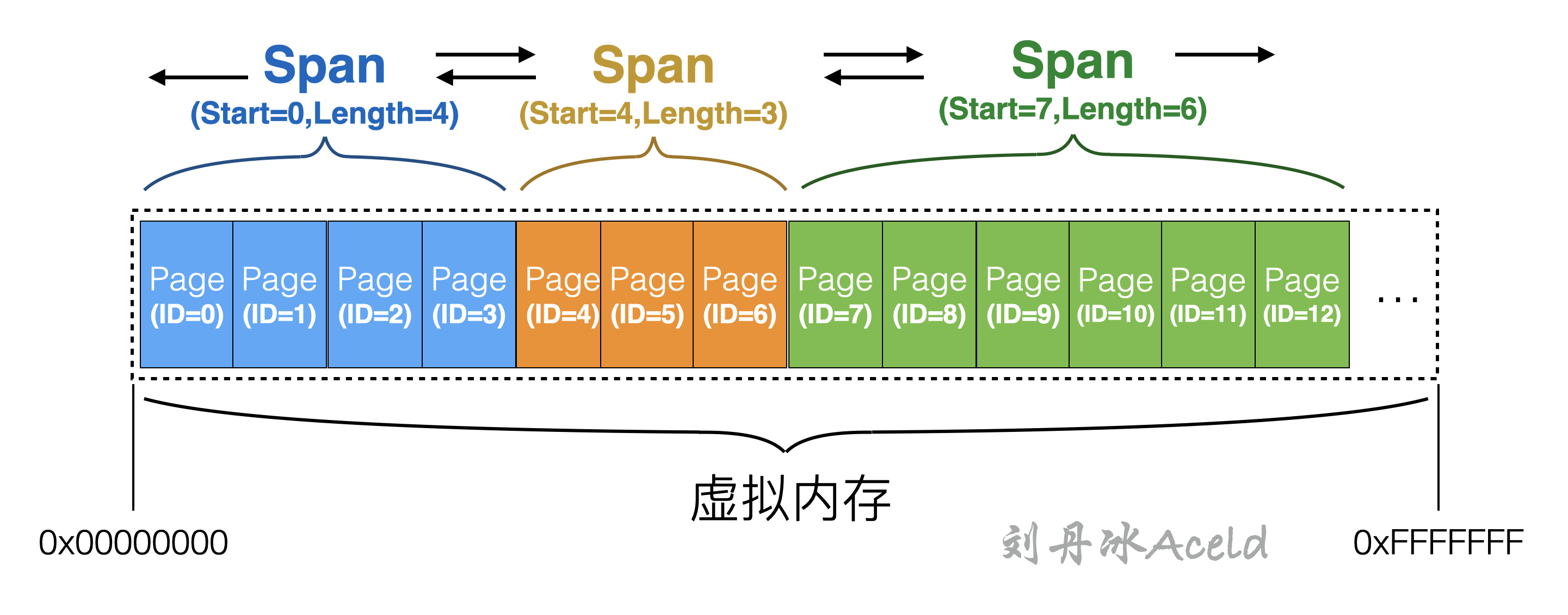 多个连续的 Page 称之为一个Span,每个 Span 记录了第一个起始 Page 的编号 Start,和一共有多少个连续 Page 的数量 Length,Span 集合是以双向链表的形式构建,TCMalloc 以 Span 为单位向操作系统申请内存