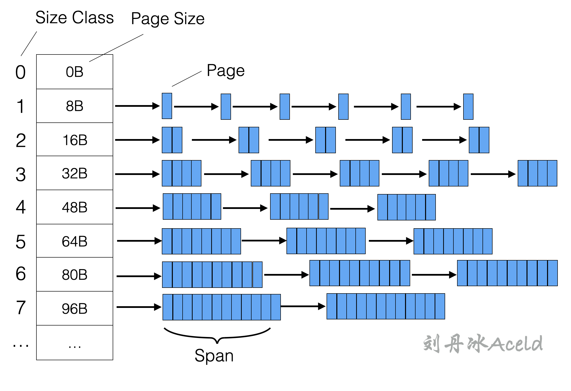 在256KB 以内的小对象,TCMalloc 会将这些小对象集合根据 Page Size 划分成多个内存刻度,同属于一个刻度类别下的内存集合称之为属于一个Size Class