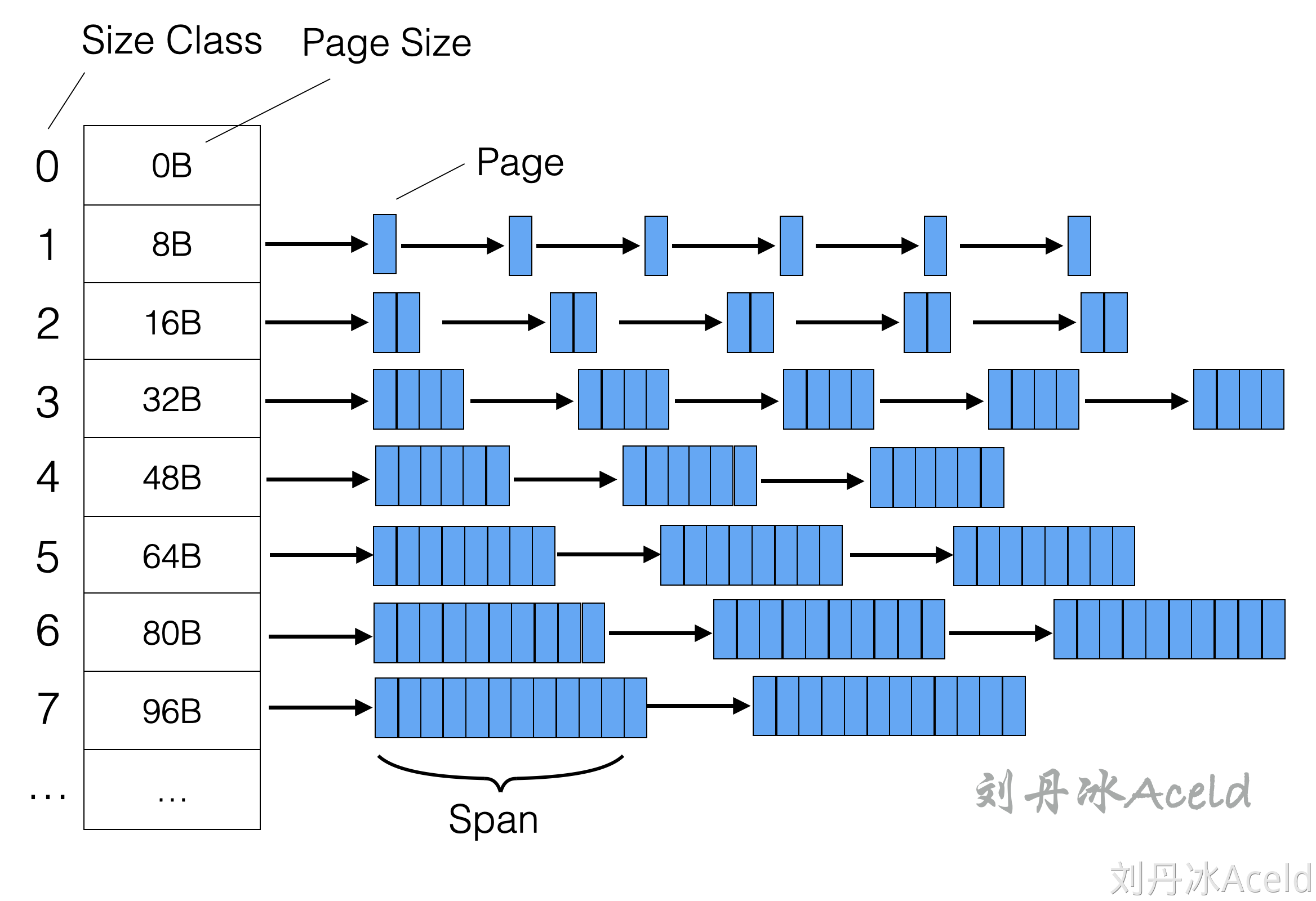 在256KB 以内的小对象,TCMalloc 会将这些小对象集合根据 Page Size 划分成多个内存刻度,同属于一个刻度类别下的内存集合称之为属于一个Size Class