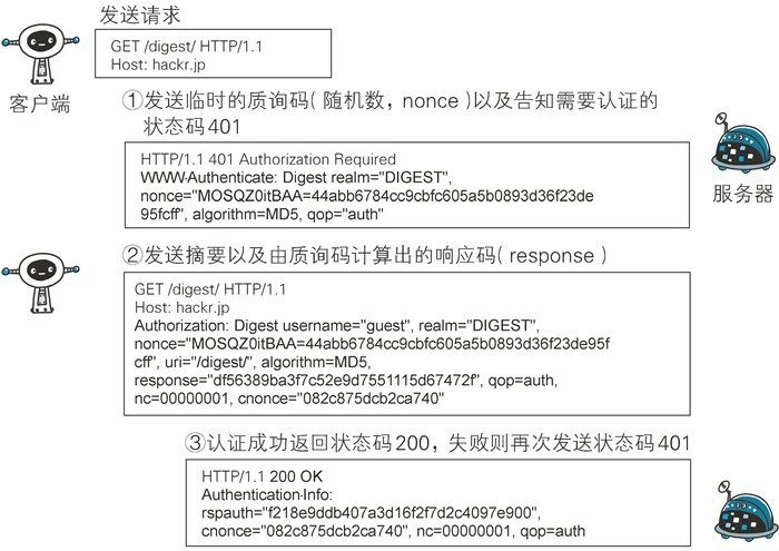 Authorization内必须包含username、realm、nonce、uri和response的字段信息。realm和nonce就是之前从服务器接收到的响应中的字段。username是realm限定范围内可进行认证的用户名uri(digest-uri)即Request-URI的值,经代理转发后Request-URI的值可能被修改,因此事先会复制一份副本保存在uri内。response也可叫做Request-Digest,存放经过 MD5 运算后的密码字符串,形成响应码。